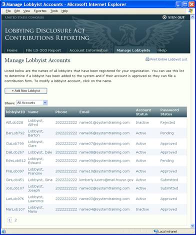 The Manage Lobbyist screen will allow you to view, and print, a list of all the employees that were actively registered to lobby on the registration or reporting forms. You can use this list to verify if your employees have been registered and whether the account has been activated so that they are able to sign in and file their contribution reports.